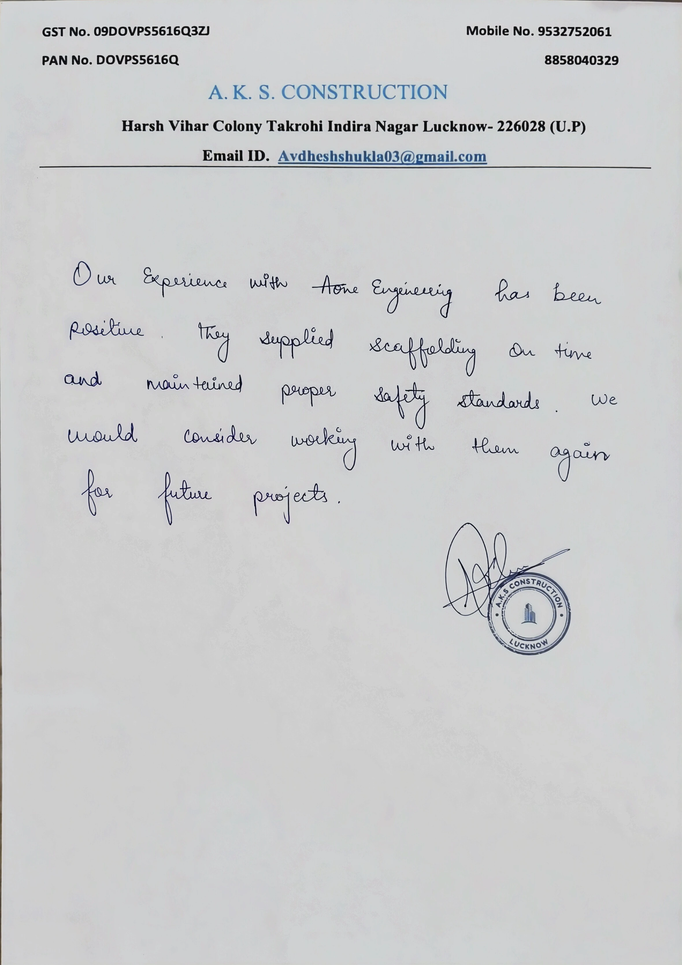 We are satisfied with the services provided by Aone Engineering for Scaffolding work at site.