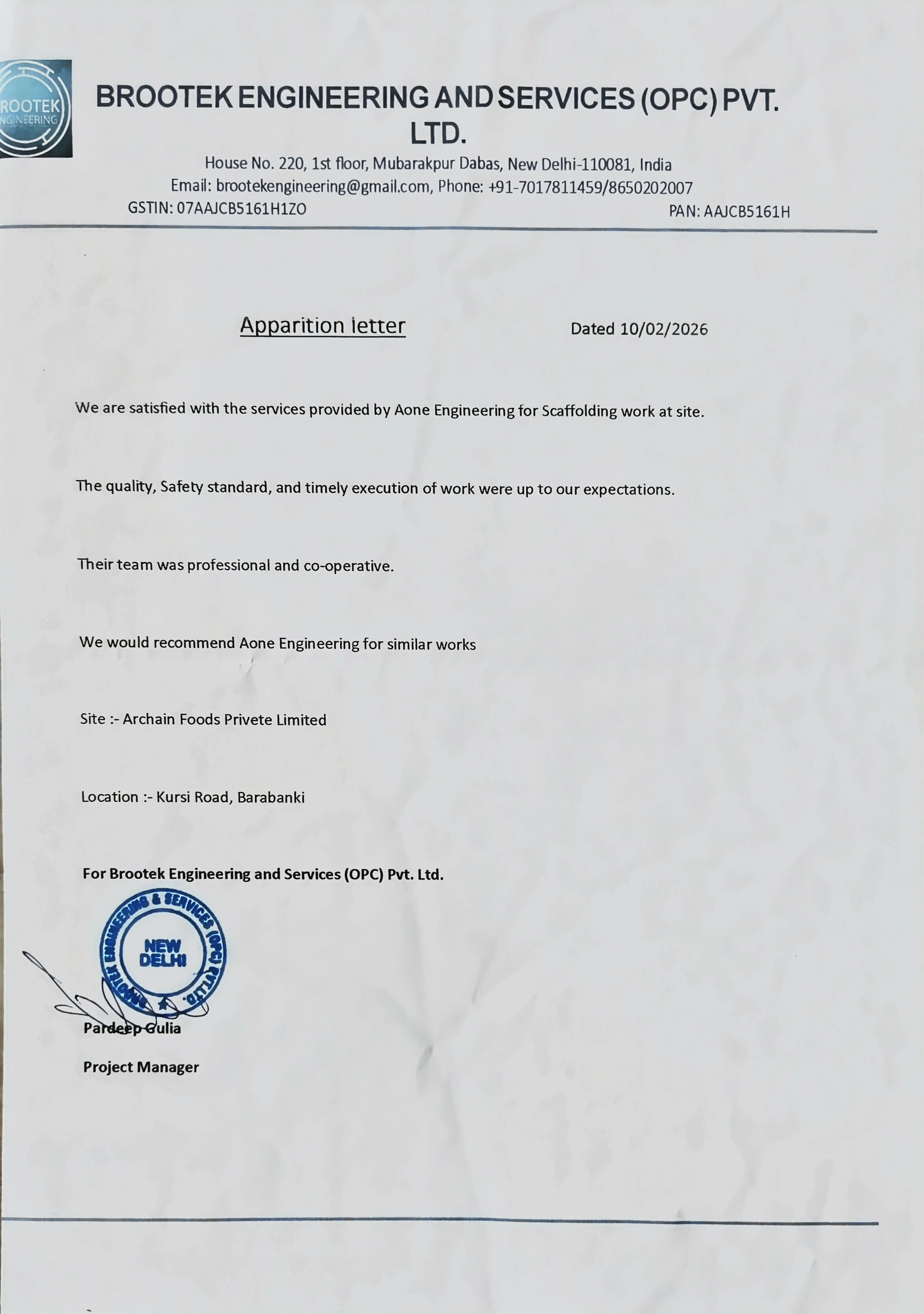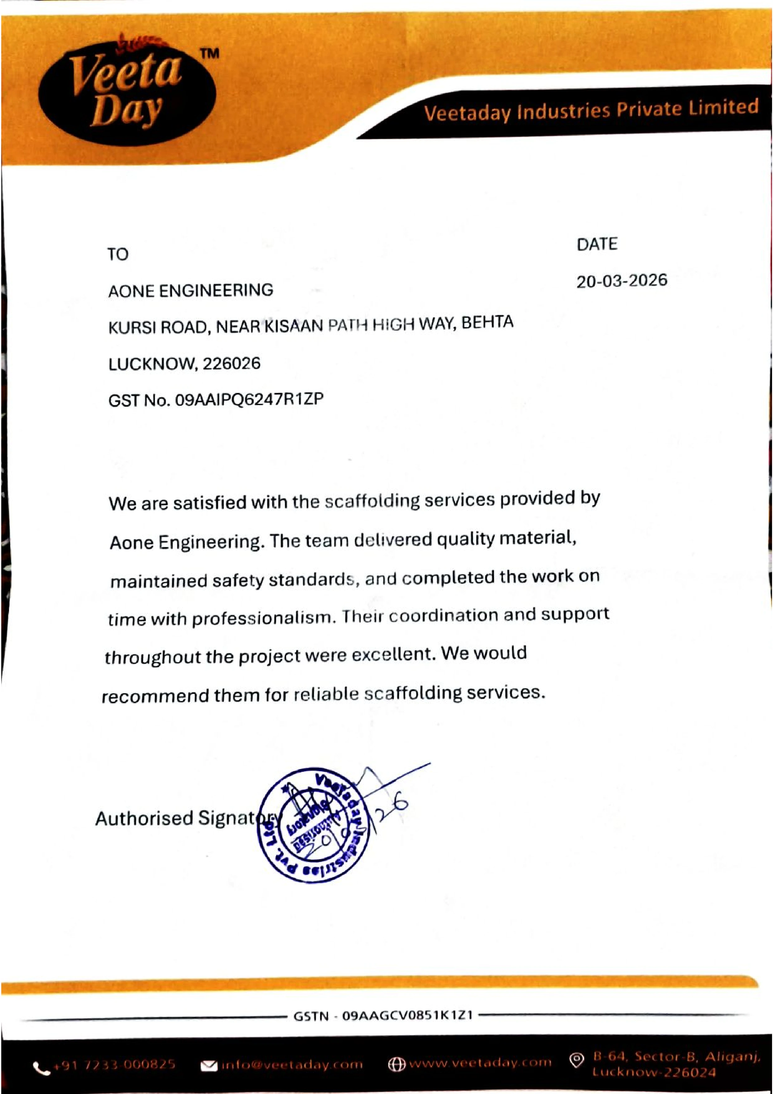 We are satisfied with the services provided by Aone Engineering for Scaffolding work at site.